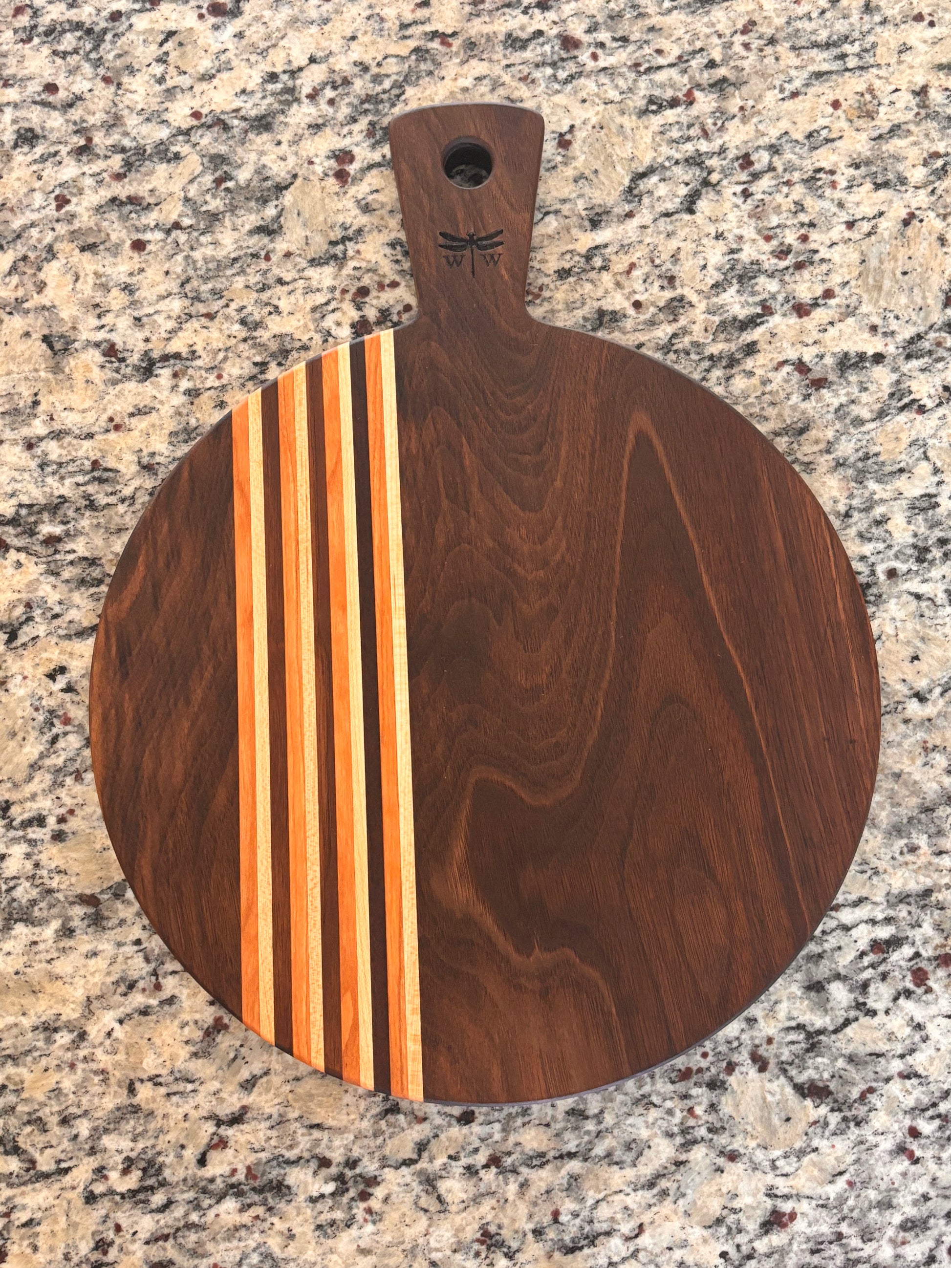 Elevate your kitchen with this handcrafted Round walnut charcuterie board, accented with elegant strips of maple, cherry, and walnut. Each board is uniquely crafted to highlight the rich contrast and natural beauty of these premium hardwoods — a perfect blend of function and artistry.